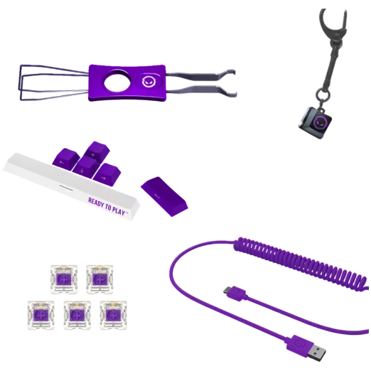 Цепочка с переключателем и кейкапом — можно заменить любую клавишу на вашей клавиатуре; шесть дополнительных кейкапов, соответствующих стилю модели устройства, пять запасных переключателей, щётка для чистки клавиатуры, универсальный извлекатель переключателей/кейкапов для лёгкой кастомизации, две грелки для рук, подставка под чашку для рабочего стола и сумка для переноски.